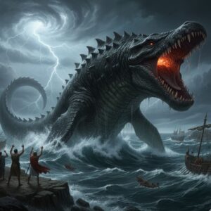 La storia del Leviatano inizia in diverse parti dell’Antico Testamento, in particolare nei libri di Giobbe, dei Salmi e di Isaia. Le descrizioni sono così dettagliate da far dubitare che gli scrittori stessero descrivendo qualcosa di reale. Nel libro di Giobbe, il Leviatano viene introdotto da Dio stesso. Dio lo descrive come una creatura che nessun uomo può sconfiggere, il cui corpo è coperto da spesse scaglie simili a un’armatura. Il suo respiro può accendere i carboni, i suoi occhi brillano come il sole del mattino, lance e frecce rimbalzano su di lui, e agita il mare come acqua bollente. Il messaggio è chiaro: il Leviatano è una creatura di potere travolgente che nessun essere umano potrebbe mai controllare. In questo modo, diventa un simbolo del caos che solo Dio può domare.