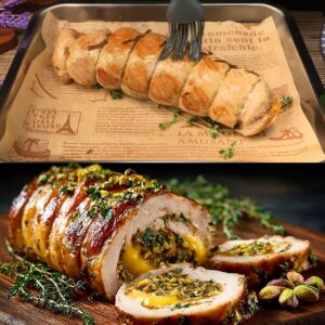 Trasferite il rotolo in una teglia foderata di carta forno, adagiandolo sopra dei rametti di timo fresco. Spennellate con l’olio di cottura rimasto.